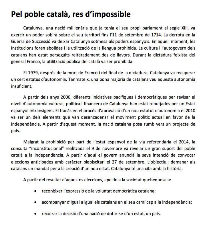 –‘Le mandat sera de construire un pays indépendant en Catalogne’ (‘El mandat serà de construir un país independent a Catalunya’)