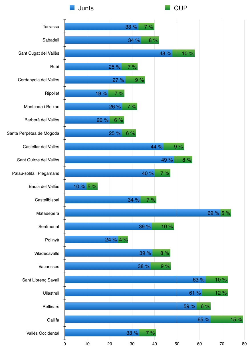 Aquesta és la suma del percentatge de vots de Junts pel Sí i la CUP al municipis del Vallès Occidental.