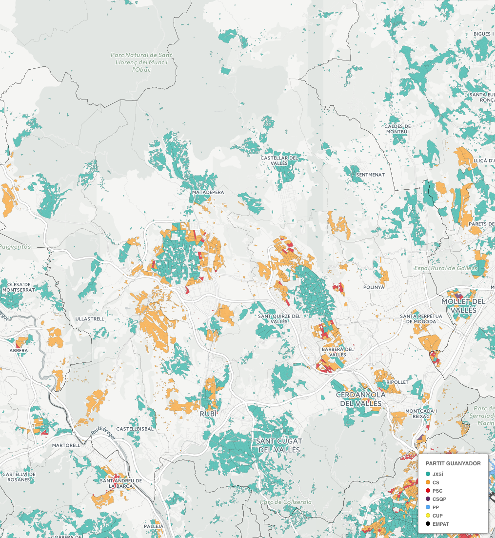 Aquest mapa ajuda a veure quin partit ha guanyat a cada secció censal. Font Vilaweb.