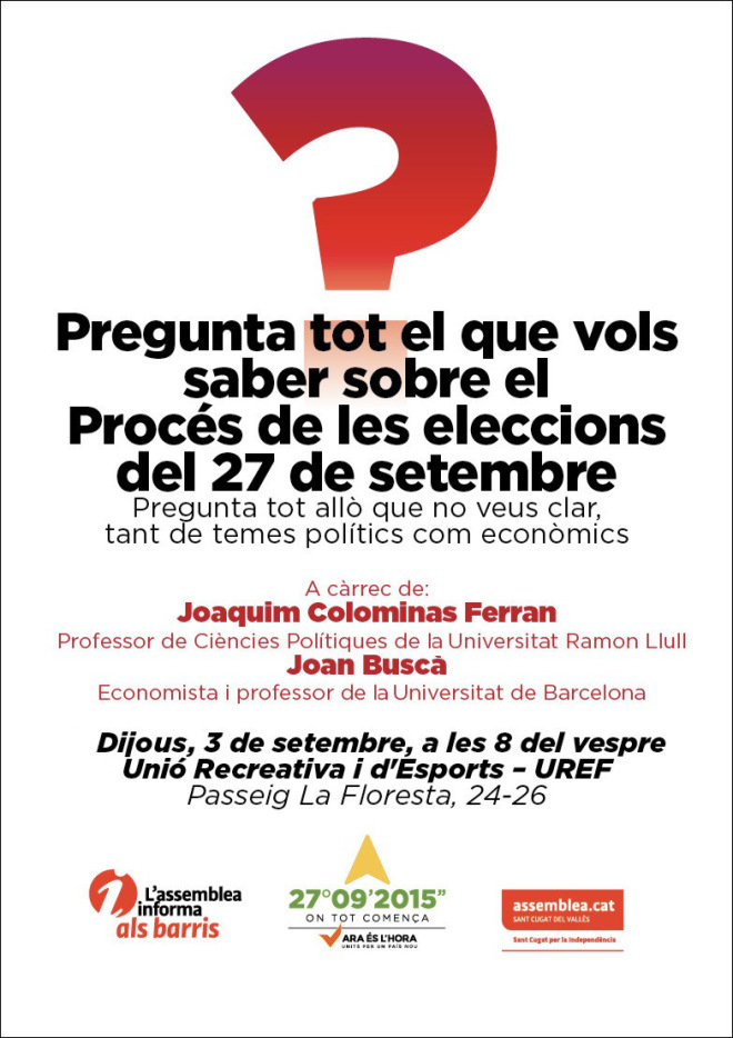 Aquest proper 3 de setembre, a les 8 del vespre, a la Unió Recreativa i d’Esports (UREF) de la Floresta (Passeig de La Floresta 24-26), els voluntaris de l’Assemblea informa als barris de l’ANC de Sant Cugat han organitzat l’acte