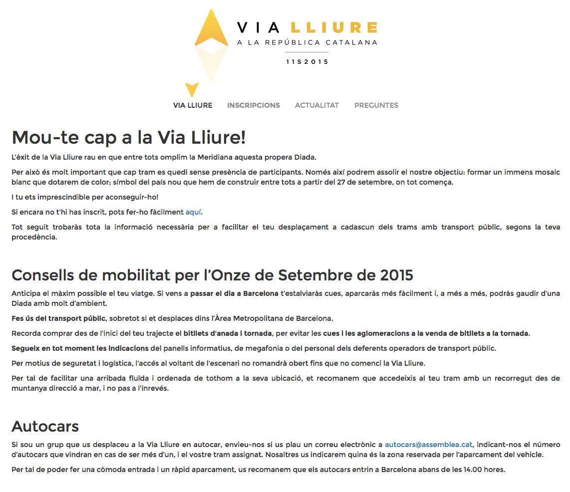 L’ANC ha recollit dins la pàgina de la ‘Via Lliure’: http://via.assemblea.cat una secció amb tota la informació necessària per a arribar a la Meridiana l’11 de setembre. La pàgina neix amb la intenció de facilitar la mobilitat i garantir la presència a la Diada més decisiva de tothom qui vulgui ser-hi.