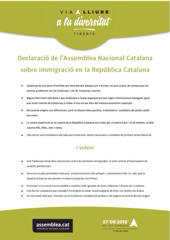Aquest diumenge, dins dia festa de la Festa de la diversitat cultural que es farà a Terrassa, l’Assemblea Nacional Catalana presentarà la Declaració sobre la immigració en la República Catalana. El document  crida a “participar a la creació d’una república catalana amb igualtat de drets, llibertats i deures per a tothom” i ha estat signat per milers de persones i entitats de catalans provinents de tot el món. La iniciativa està acompanyada d’11 vídeos que ja circulen a la xarxa.