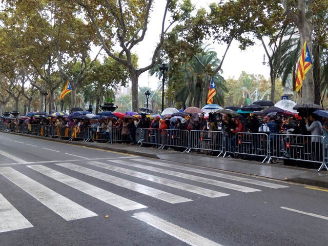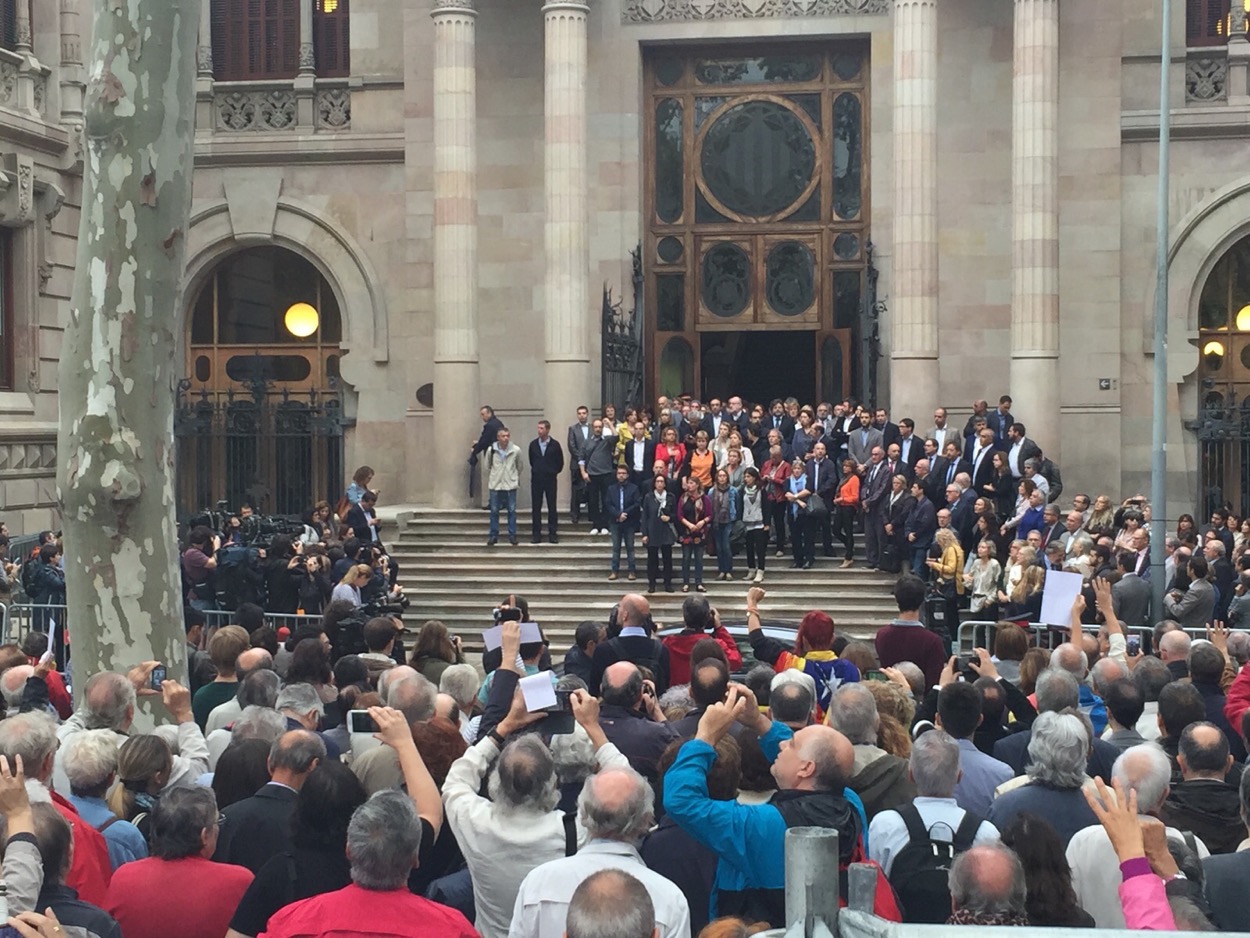 Centenars de ciutadans han seguit, malgrat la pluja, la convocatòria de l’ANC, Òmnium, ACM i l’AMI i s’han concentrat avui a la tarda a les portes del Tribunal Superior de Justícia de Catalunya per donar suport a la democràcia i a l’ex vicepresidenta, Joana Ortega, qui ha anat a declarar com a imputada per la consulta del 9N.