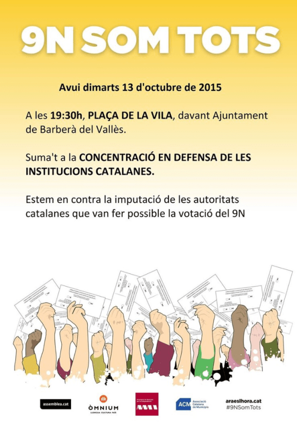 Avui mateix, aprofitant el primer dia de compareixences dels responsables polítics de posar les urnes el 9N i fer possible una consulta democràtica a la qual van participar 2’4 milions de ciutadans, es celebrarà davant els ajuntaments un acte descentralitzat en el qual es llegirà un manifest del Pacte Nacional pel Dret a Decidir (19.30).