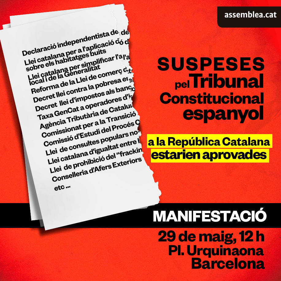 L’ANC dóna el seu ple suport a la manifestació d’aquest diumenge 29 de maig en defensa de les lleis i els drets socials aprovats pel Parlament de Catalunya i suspeses pel Tribunal Constitucional espanyol: els drets socials dels catalans, no se suspenen.