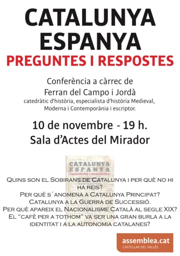 nov. 9 2016 10 de novembre, a Castellar del Vallès, conferència “Catalunya-Espanya” Dijous 10 de novembre, a Castellar del Vallès, a les 19 hores conferència. “Catalunya-Espanya preguntes i respostes“. Ho exposarà el catedratic d’història. Ferran del Campo a la sala d’Actes del Mirador. Feu clic per enviar un enllaç per correu electrònic a un amic (S'obre en una nova finestra) Correu electrònic Feu clic per compartir al Facebook (S'obre en una nova finestra) Facebook Feu clic per compartir a X (S'obre en una nova finestra) X Feu clic per compartir al WhatsApp (S'obre en una nova finestra) WhatsApp Feu clic per compartir al Telegram (S'obre en una nova finestra) Telegram Feu clic per compartir al Mastodon (S'obre en una nova finestra) Mastodon Més Feu clic per imprimir (S'obre en una nova finestra) Imprimeix Fes clic per compartir al Linkedin (S'obre en una nova finestra) LinkedIn Feu clic per compartir al Tumblr (S'obre en una nova finestra) Tumblr Feu clic per compartir al Pinterest (S'obre en una nova finestra) Pinterest Fes clic per compartir al Reddit (S'obre en una nova finestra) Reddit Feu clic per compartir al Pocket (S'obre en una nova finestra) Pocket M'agrada S'està carregant...