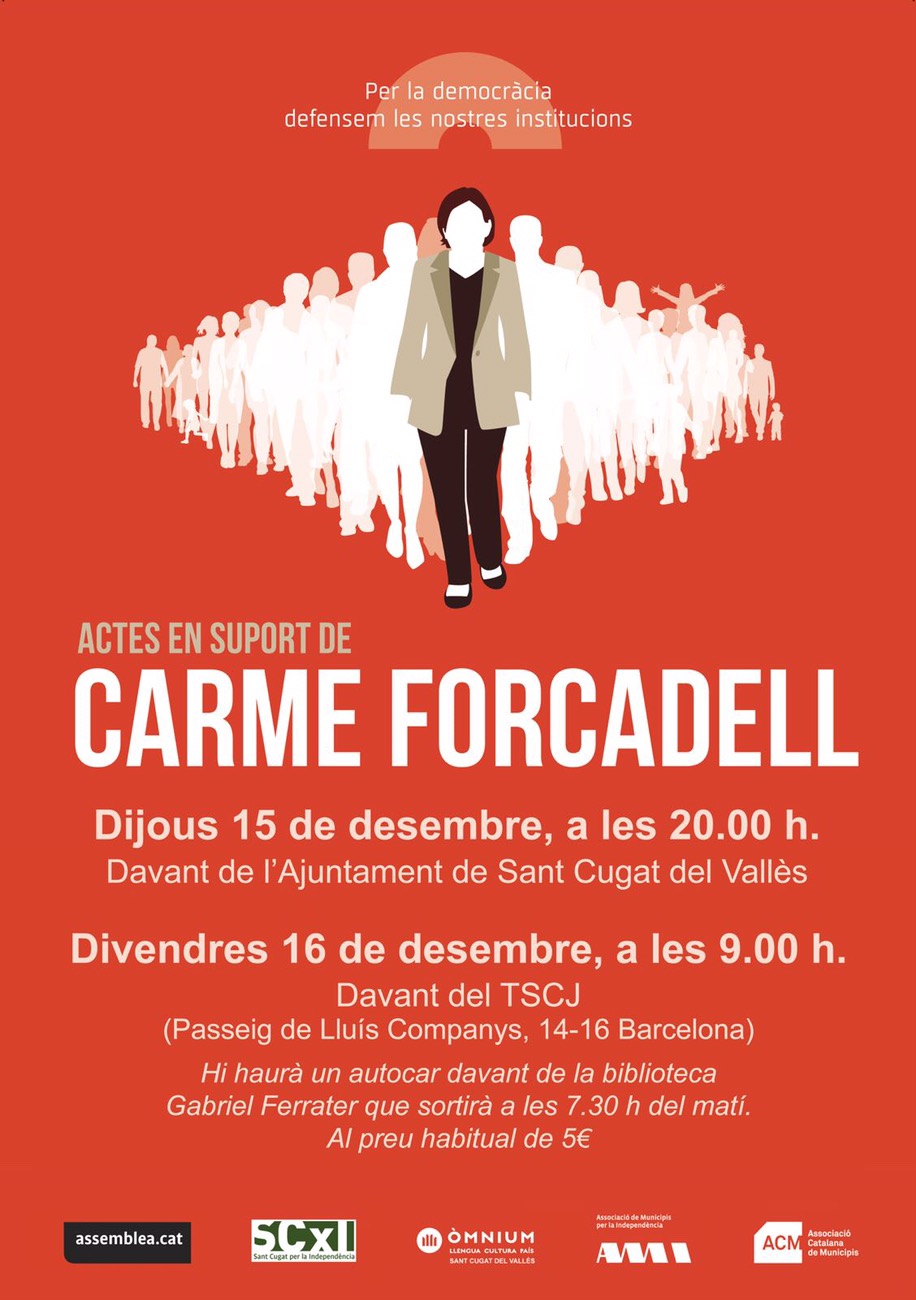 El pròxim 16 de desembre, la presidenta del Parlament, Carme Forcadell, ha estat citada a declarar al Tribunal Superior de Justícia de Catalunya. Per aquest motiu, us convoquem per a donar-li suport amb un missatge clar. Ella va ser escollida democràticament per a representar el poble de Catalunya i estarem al seu costat especialment quan sigui cridada a declarar davant tribunals per un suposat delicte de desobediència al Tribunal Constitucional.