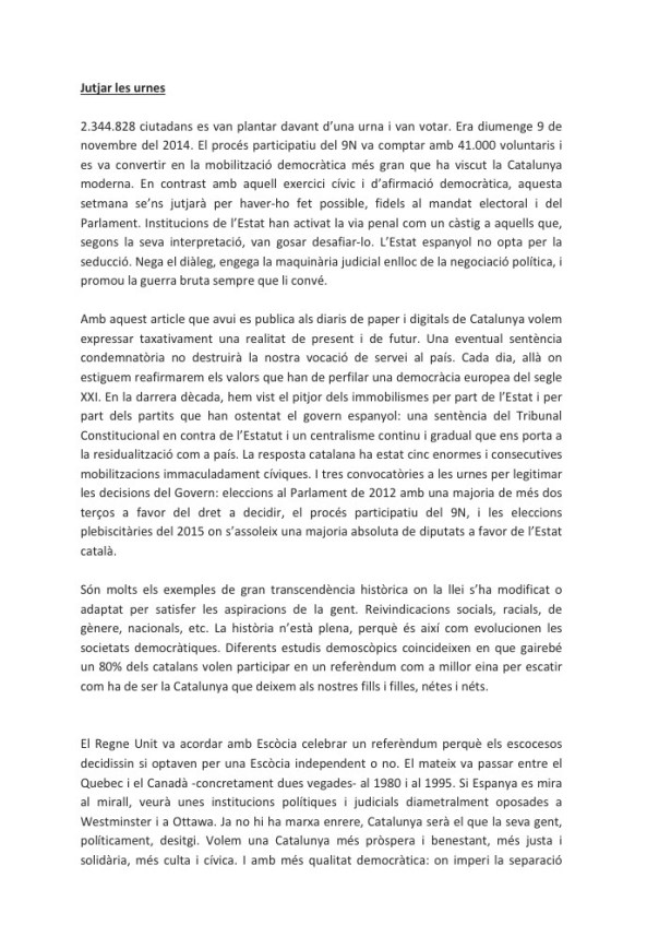Amb aquest article que avui es publica als diaris de paper i digitals de Catalunya volem expressar taxativament una realitat de present i de futur. Una eventual sentència condemnatòria no destruirà la nostra vocació de servei al país. Cada dia, allà on estiguem reafirmarem els valors que han de perfilar una democràcia europea del segle XXI. En la darrera dècada, hem vist el pitjor dels immobilismes per part de l’Estat i per part dels partits que han ostentat el govern espanyol: una sentència del Tribunal Constitucional en contra de l’Estatut i un centralisme continu i gradual que ens porta a la residualització com a país. La resposta catalana ha estat cinc enormes i consecutives mobilitzacions immaculadament cíviques. I tres convocatòries a les urnes per legitimar les decisions del Govern: eleccions al Parlament de 2012 amb una majoria de més dos terços a favor del dret a decidir, el procés participatiu del 9N, i les eleccions plebiscitàries del 2015 on s’assoleix una majoria absoluta de diputats a favor de l’Estat català.