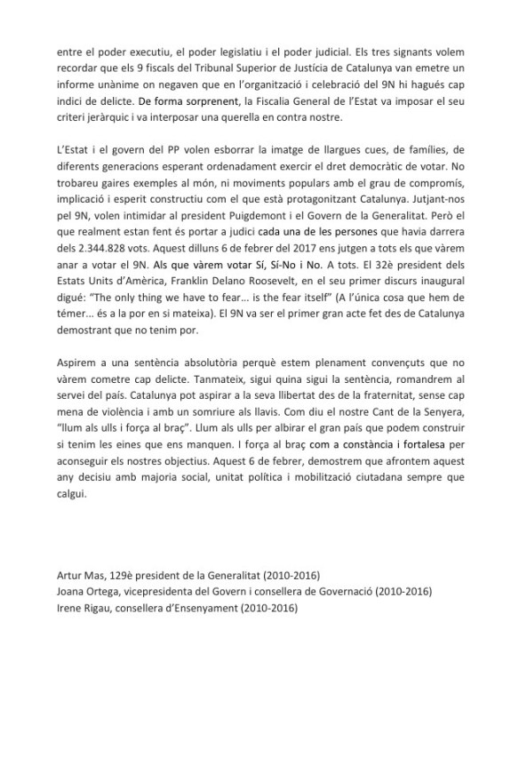 L’Estat i el govern del PP volen esborrar la imatge de llargues cues, de famílies, de diferents generacions esperant ordenadament exercir el dret democràtic de votar. No trobareu gaires exemples al món, ni moviments populars amb el grau de compromís, implicació i esperit constructiu com el que està protagonitzant Catalunya. Jutjant-nos pel 9N, volen intimidar al president Puigdemont i el Govern de la Generalitat. Però el que realment estan fent és portar a judici cada una de les persones que havia darrera dels 2.344.828 vots. Aquest dilluns 6 de febrer del 2017 ens jutgen a tots els que vàrem anar a votar el 9N. Als que vàrem votar Sí, Sí-No i No. A tots. El 32è president dels Estats Units d’Amèrica, Franklin Delano Roosevelt, en el seu primer discurs inaugural digué: “The only thing we have to fear… is the fear itself” (A l’única cosa que hem de témer… és a la por en si mateixa). El 9N va ser el primer gran acte fet des de Catalunya demostrant que no tenim por.