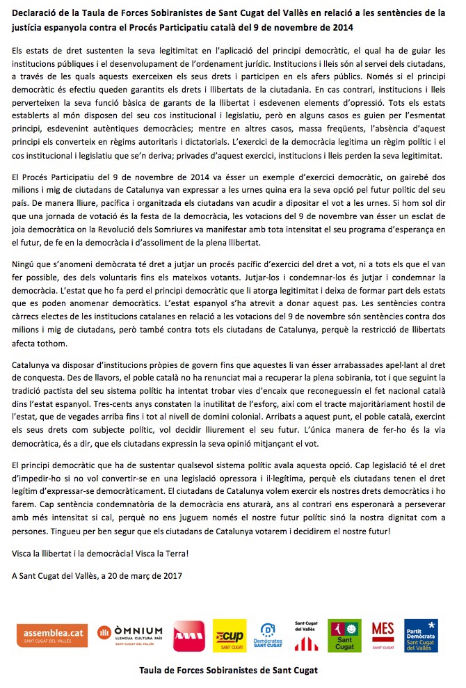 En conseqüència, l’escenari del referèndum acordat és el que desitjaríem a Catalunya. Volem recordar que ja l’hem proposat en diverses ocasions. Avui, tot i els mals auguris i el rebuig frontal del Govern espanyol, tornem a insistir-hi. Potser és injust atribuir al president Rajoy, al seu govern i al seu partit aquesta actitud en exclusiva. Observem amb pena i tristesa que aquesta mateixa posició, sense cap mena de matís, la comparteixen PP, PSOE i Cs.