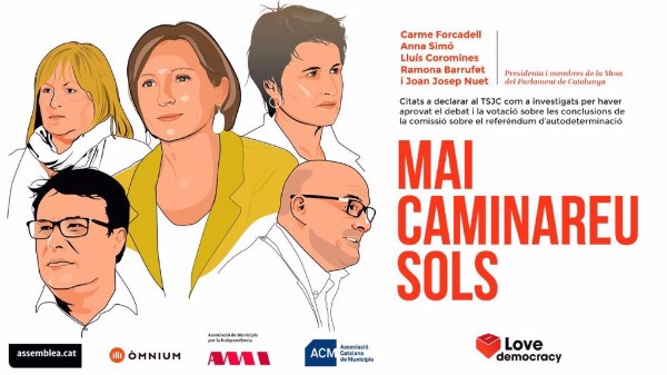 L’Assemblea Nacional Catalana, Òmnium Cultural, l’Associació de Municipis per la Independència i l’Associació Catalana de Municipis convoquen a l’acompanyament de la presidenta del Parlament, Carme Forcadell, i dels membres de la mesa Lluís Corominas, Anna Simó, Ramona Barrufet i Joan Josep Nuet.