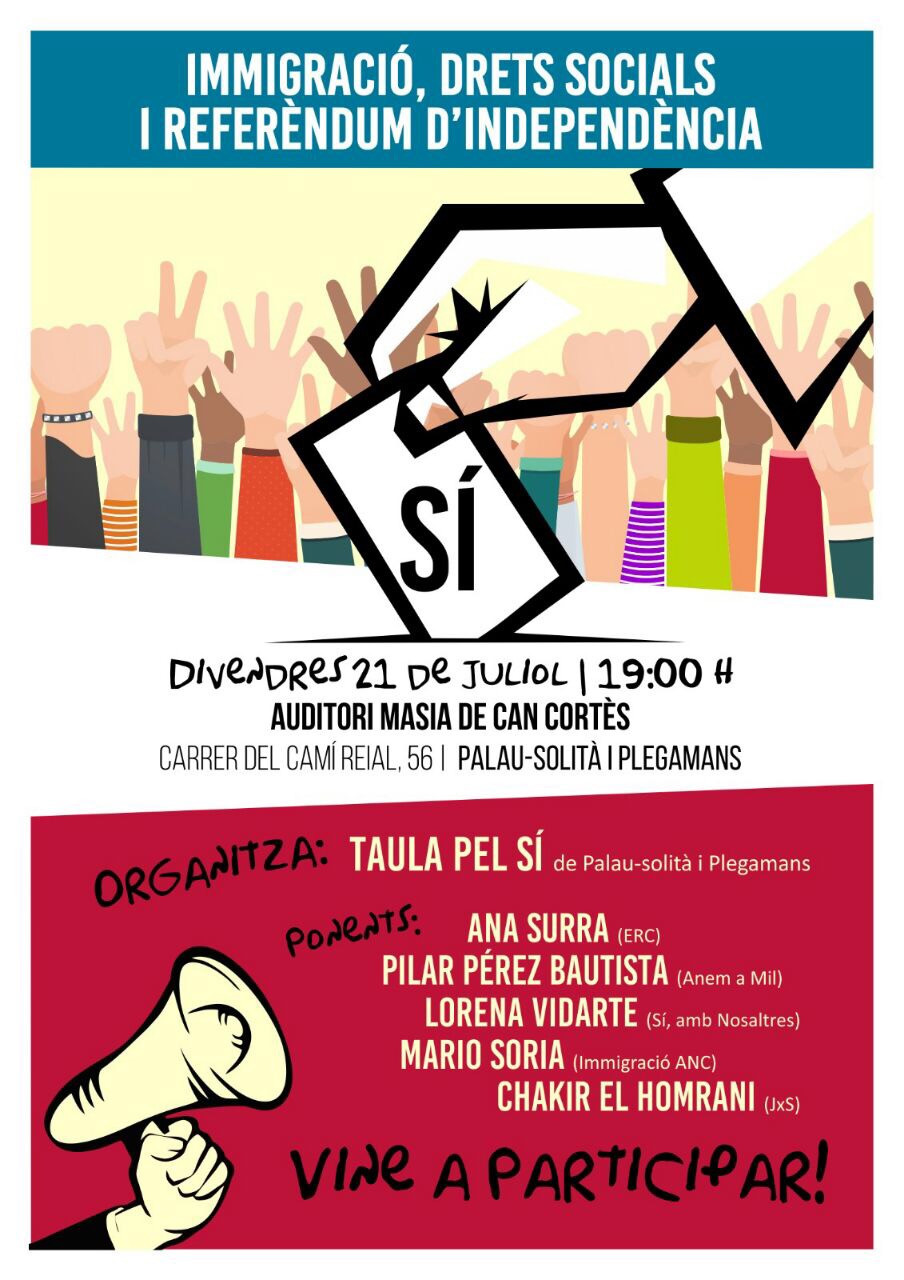 El divendres 21 de juliol, a Palau-solità i Plegamans, és farà la xerrada sobre “Immigració, drets socials i referèndum i independència”.