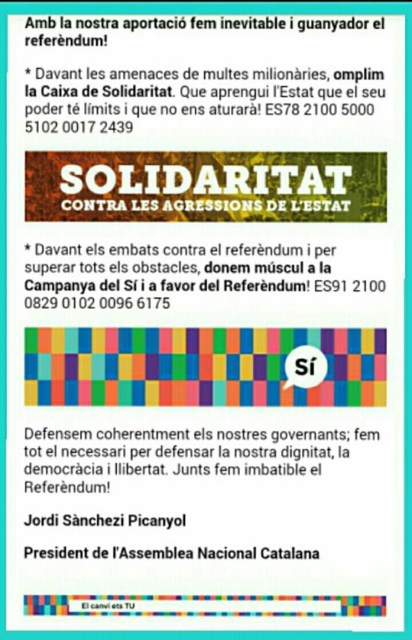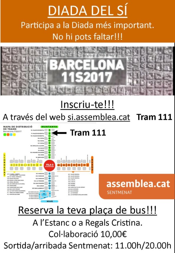 Perquè l’11 de Setembre de 2017 sigui un èxit i ens porti a un Sí massiu en el referèndum de l’1 d’octubre, clicant aquí teniu tota la informació.