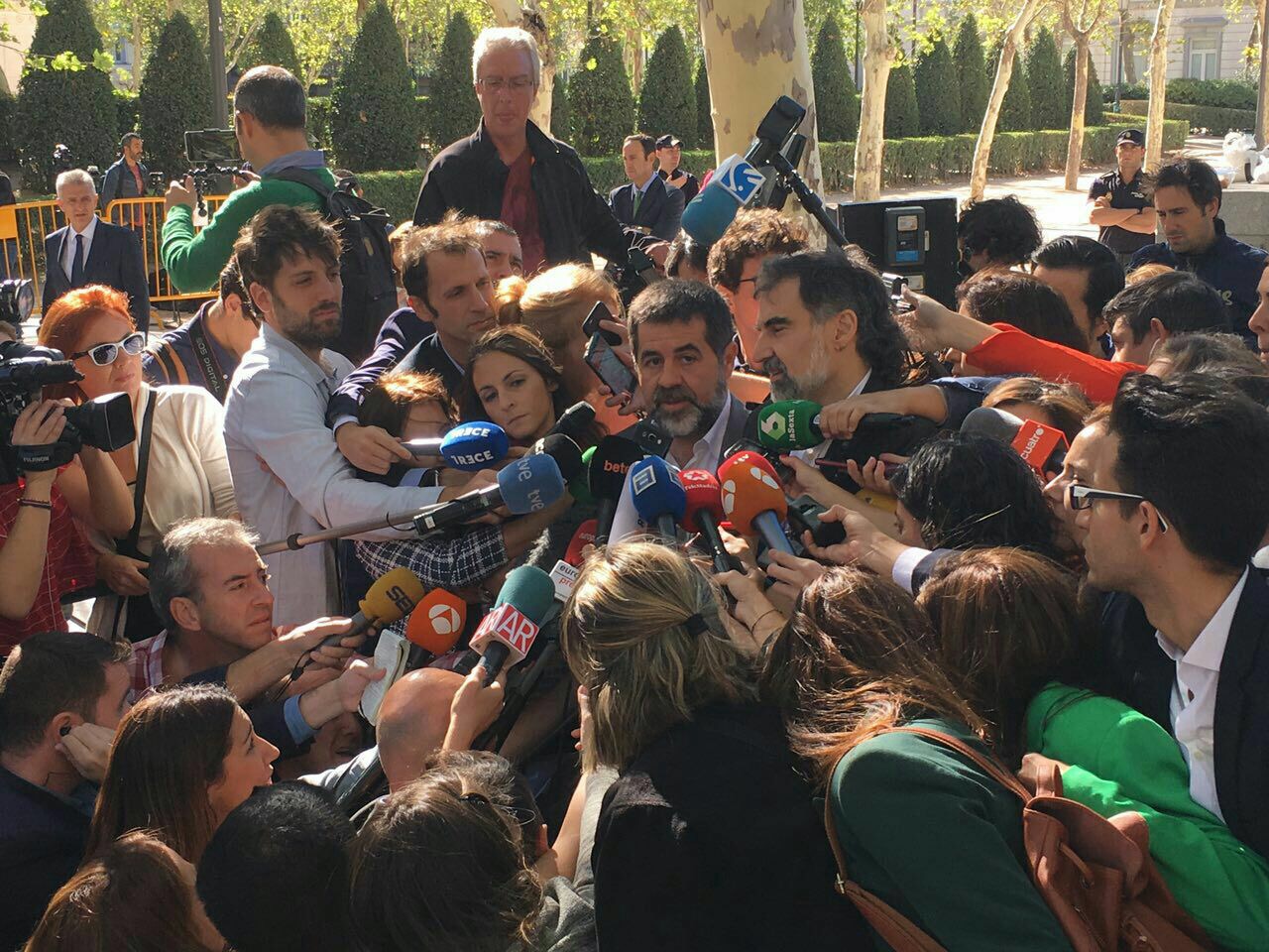 Jordi Sànchez i Jordi Cuixart han sortir de l’Audiència Nacional. Tots dos havien entrat a primera hora del matí, i després d’aproximadament tres hores ja han acabat la compareixença. Sànchez només ha contestat les preguntes del seu advocat, mentre que Cuixart finalment ha decidit no declarar. Tant ells dos com també els altres dos declarants d’avui, el Major dels Mossos d’Esquadra, Josep Lluís Trapero, i la intendent Teresa Laplana, han sortit en llibertat i sense mesures cautelars.