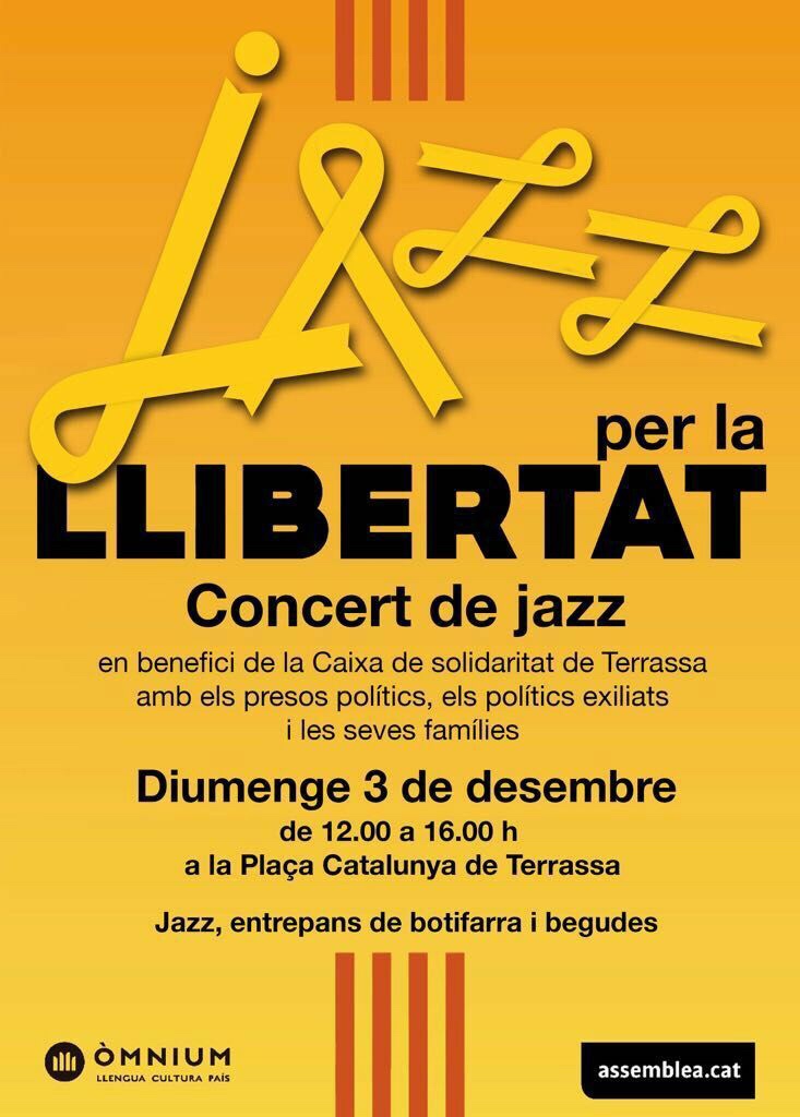 Diumenge 3 de desembre tindrà lloc, a la plaça de Catalunya de Terrassa, «Jazz per la Llibertat», acte convocat per l’ANC -Terrassa per la Independència i Òmnium Cultural -Terrassa amb el propòsit de recollir fons per als presos polítics, els polítics exiliats i les seves famílies.