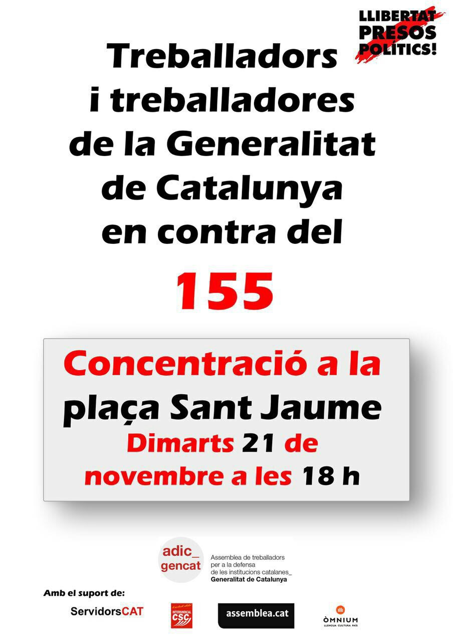 Els treballadors de la Generalitat faran aquest dimarts 21 de novembre una concentració en contra de l’aplicació de l’article 155.
