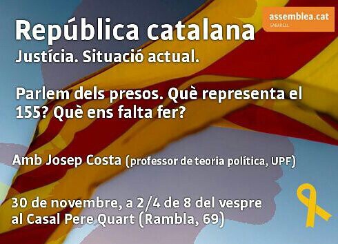 Avui dijous 30 de novembre, a Sabadell, el professor de Teoria Política de la UPF parlarà del moment actual, amb el govern català destituït per l’article 155 i les eleccions del 21D a la vista.