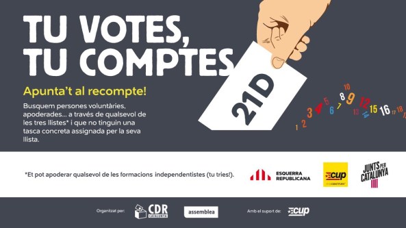 L’Assemblea Nacional Catalana, els Comitès de Defensa de la República i la Candidatura d’Unitat Popular han presentat campanya “Tu votes, tu comptes”. La campanya té per objectiu que la societat civil pugui presentar un recompte paral·lel al de la junta electoral espanyola.