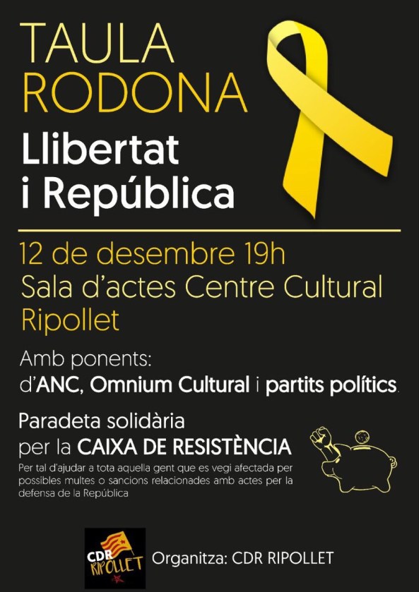 Aquest dimarts 12 de desembre es farà a Ripollet una taula rodona amb el tema “Llibertat i República”.
