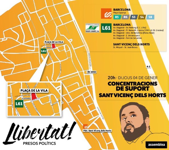 Dijous, 4 de gener, el Tribunal Suprem decideix si Oriol Junqueras surt o no de la presó. Sigui quina sigui la decisió, l’Assemblea Nacional Catalana i Òmnium Cultural covoquen la ciutadania a les 20:00 a Sant Vicenç dels Horts per mostrar el caliu a la seva família i veïns.