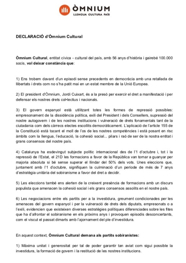- Que les forces polítiques sobiranistes assumeixin la responsabilitat que els han donat les urnes, que parlin clar a la ciutadania i expliquin amb la màxima transparència quines són les estratègies que cadascú creu que cal seguir a partir d’ara. La societat catalana ha donat sobrades mostres de maduresa per poder entendre que davant un context polític complex i de repressió, les respostes polítiques també han de ser complexes; i que no hi ha solucions fàcils ni ràpides. En aquest sentit, Òmnium es troba en un procés de reflexió estratègica que pretén contribuir al necessari debat de futur que ha d’afrontar el sobiranisme.