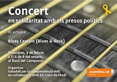 Divendres 9 de febrer, a 2/4 de 8 del vespre, ens trobarem al Racó del Campanar per sentir el segon concert a favor de la llibertat dels presos polítics i de suport a la caixa de solidaritat amb els nostres representants polítics i els Jordis empresonats.