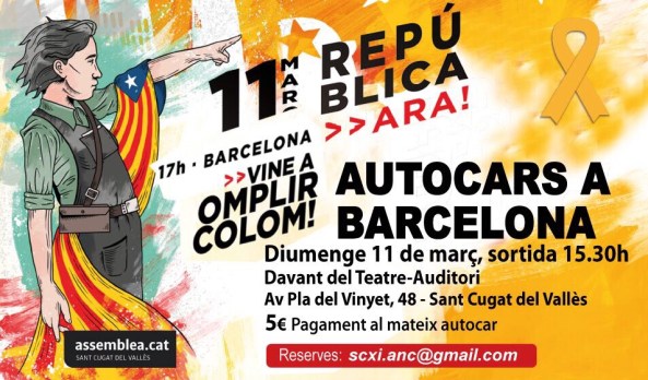 La manifestació de l’11 de març començarà al passeig de Colom a les 17.00 h i acabarà davant el Parc de la Ciutadella amb un acte polític on s’exigirà als representants polítics que compleixin allò que van prometre a les eleccions del 21 de desembre: recuperar el Govern legítim i desplegar la República.