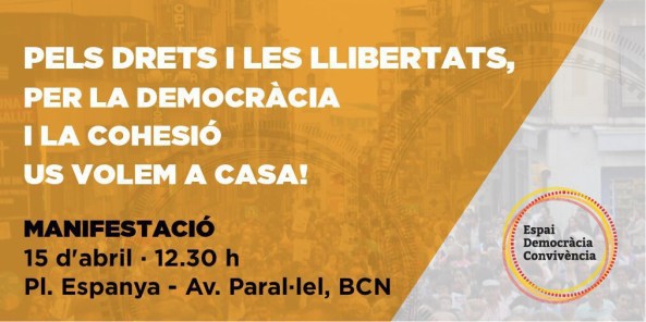Les entitats que conformen l’Espai Democràcia i Convivència, preocupades per la vulneració dels drets fonamentals i les llibertats democràtiques, fan una crida a la ciutadania a participar de la manifestació davant la necessitat de donar una resposta unitària en defensa de les institucions catalanes, els drets fonamentals, la cohesió social, el dret que té el poble català a decidir el seu futur polític i la democràcia.