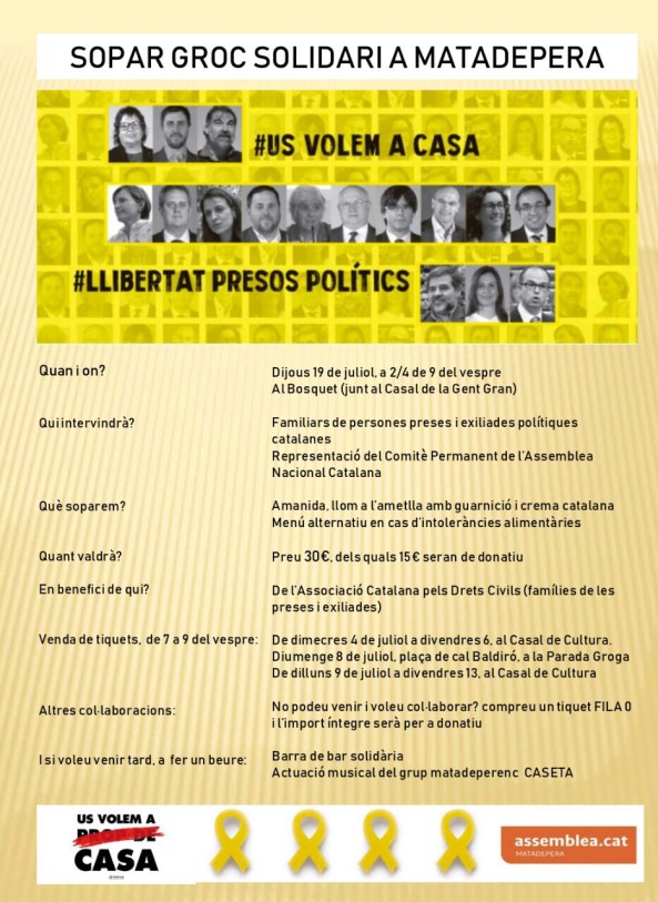 El dijous 19 de juliol, a Matadepera es farà un sopar groc solidari. El preu és de 30€ i els beneficis aniran a l’Associació Ca pels Drets Civils.