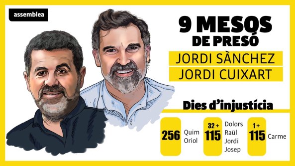 Avui, 16 de juliol, fa 9 mesos que Jordi Sànchez i Jordi Cuixart són a la presó. Una vergonya que vam tornar a denunciar aquest dissabte, massivament, a Barcelona i que tornarem a denunciar cada cop que faci falta.