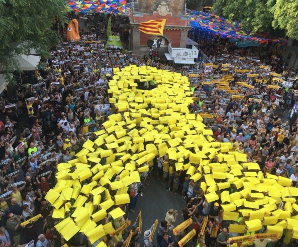 La plaça de la Vila de Gràcia s’ha tenyit de groc aquesta tarda per exigir la llibertat de Jordi Sànchez i Jordi Cuixart, que tot just avui fa 10 mesos que van ser empresonats acusats de sedició i rebel·lió. En una plaça plena de gom a gom, més d’un centenar de persones han conformat un immens llaç de color groc, fet de cartolines grogues, que ha ocupat gairebé la totalitat de la plaça. L’acte ha estat conduit per l’actriu Pepa Arenós.