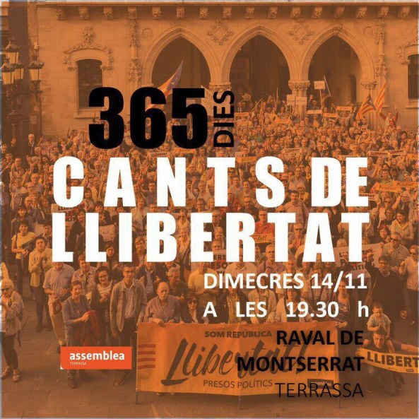 El proper dimecres 14 de novembre la resistència pacífica que representa els Cants per la Llibertat de Terrassa farà un any. Seran 365 dies d’estar cada dia reivindicant drets, exigint la llibertat dels nostres represaliats i represaliades polítiques, donant suport i veu als que la tenen censurada per la presó o l’exili.