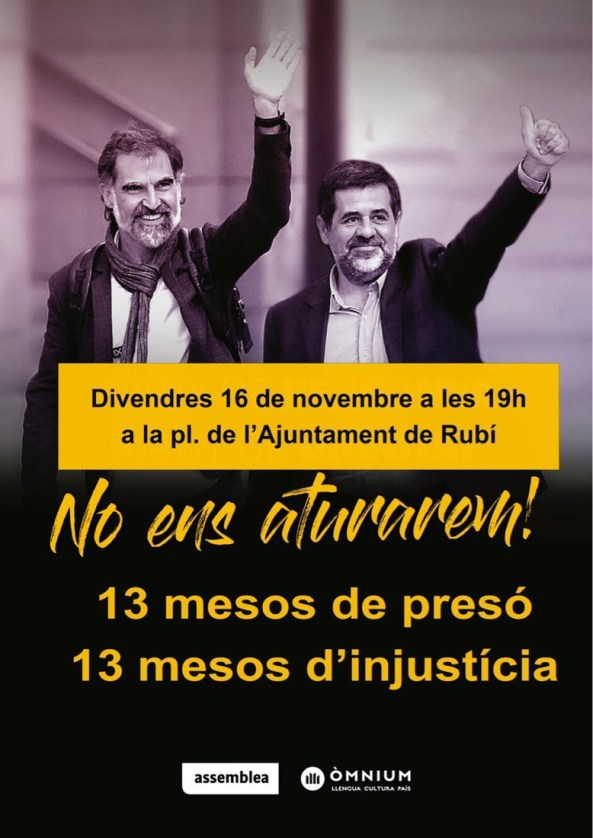 Aquest divendres 16 de novembre, a Rubí, es farà una concentració per demanar la llibertat dels presos polítics i dels exiliats.