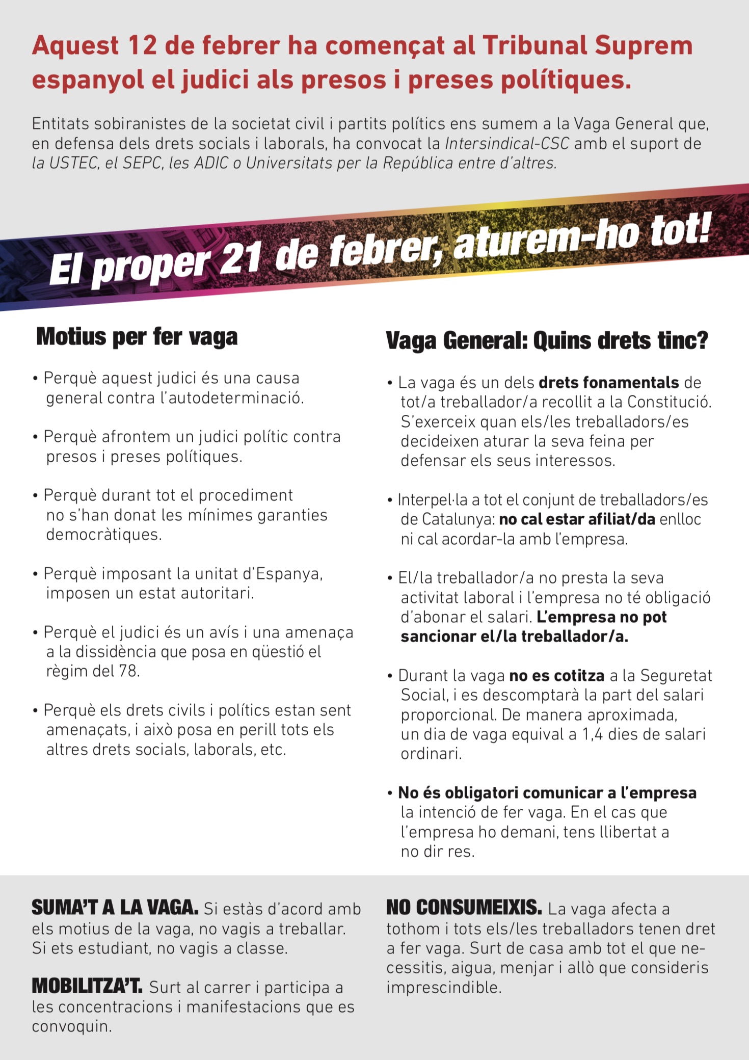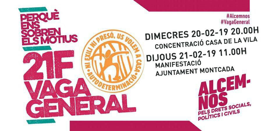 Aquest dijous, 21 de febrer, hi ha convocada una vaga general en defensa dels nostres drets fonamentals. Vivim en un context de regressió de llibertats alarmant que ens afecta a tots. Una prova n’és que s’està jutjant l’1-O i el dret a l’autodeterminació del nostre poble. Sense drets no hi ha llibertats! Per això, a l’Assemblea hi donem tot el suport i us convidem a secundar-la i a fer tot el possible per tal de contribuir a un nou èxit de mobilització a nivell de país. Informeu-ne els vostres amics, companys de feina, familiars i coneguts.