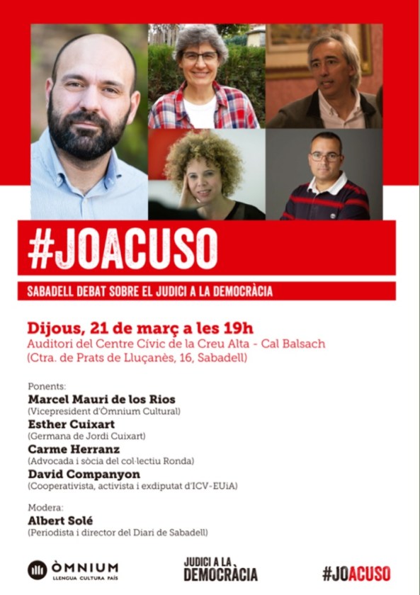 El dijous 21 de març, a les 19.00, al Centre Cívic de la Creu Alta – Cal Balsach de Sabadell, tindrà lloc l’acte #JOACUSO organitzat per Òmnium Cultural.