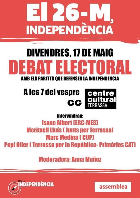 El divendres 17 de maig, a Terrassa, es farà un debat amb les candidatures independentistes que es presenten a les eleccions municipals del 26 de maig.