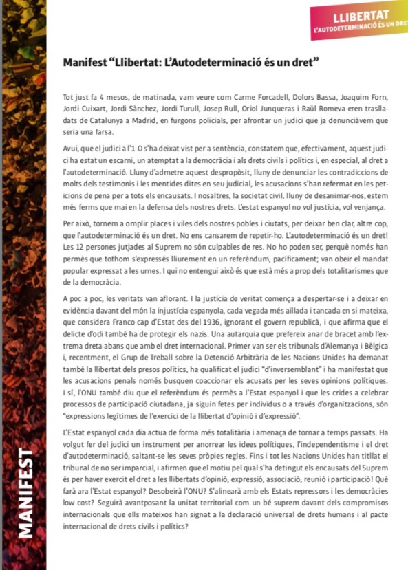 Manifest “Llibertat: L’Autodeterminació és un dret” en motiu de la fi del judici a l’1-O”.
