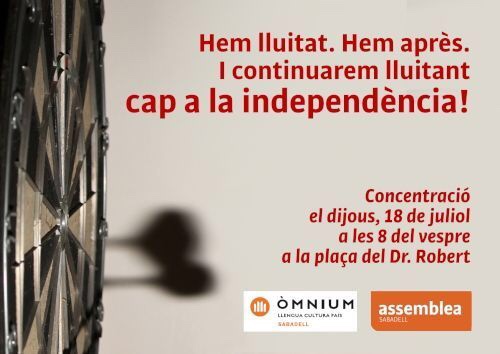 Aquest doble objectiu és compartit per tot l’independentisme i és per això que ens manifestarem aquesta Diada. No és una manifestació més, és la manifestació més difícil de totes les que hem fet fins ara, ens juguem que els partits independentistes compleixin amb el seu compromís vers el país i evitar que l’independentisme quedi adormit per anys. Enguany, us l’heu de fer vostra com mai abans i heu d’alçar la vostra veu perquè es recuperi l’objectiu de la independència, i es treballi amb unitat d’acció per assolir-lo.