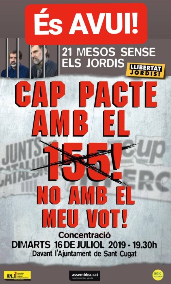 No estem disposats a rebre més bufetades. Diguem alt i clar als nostres regidors que no acceptem els pactes amb els del 155 i per descomptat, aquest tampoc. Feu arribar les vostres queixes als partits, demanant-los dignitat!