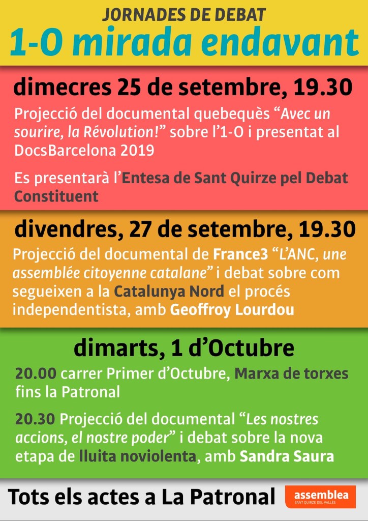 A més de la Jornada Internacional sobre Noviolència, l’Assemblea també ha estat present aquesta tarda a la manifestació que ha recorregut pels carrers de Sabadell en protesta pels empresonaments ordenats per l’Audiència Nacional aquesta setmana. La presidenta de l’Assemblea, acompanyada d’altres secretaris nacionals, ha volgut mostrar així la solidaritat de l’entitat amb els 7 nous presos polítics i amb els familiars i coneguts.
