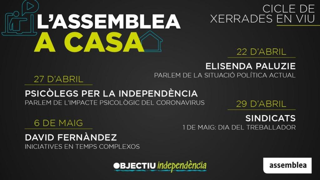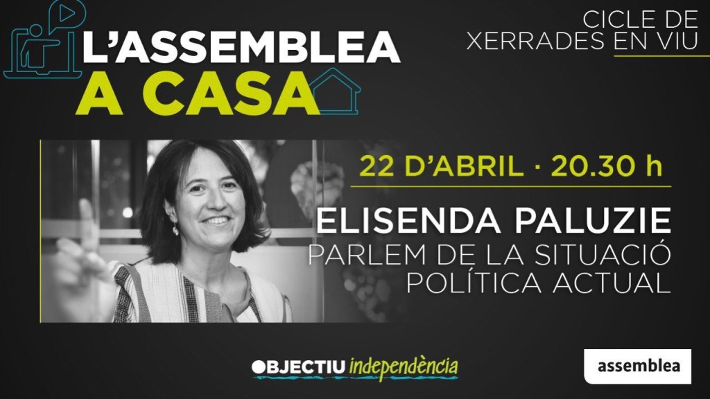 Aquest dimecres 22 d’abril, hi haurà la primera emissió de l’#AssembleaACasa amb la participació de la presidenta Elisenda Paluzie, que parlarà al voltant de la situació política actual i respondrà les preguntes de les usuàries i els usuaris.