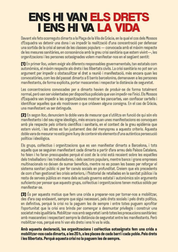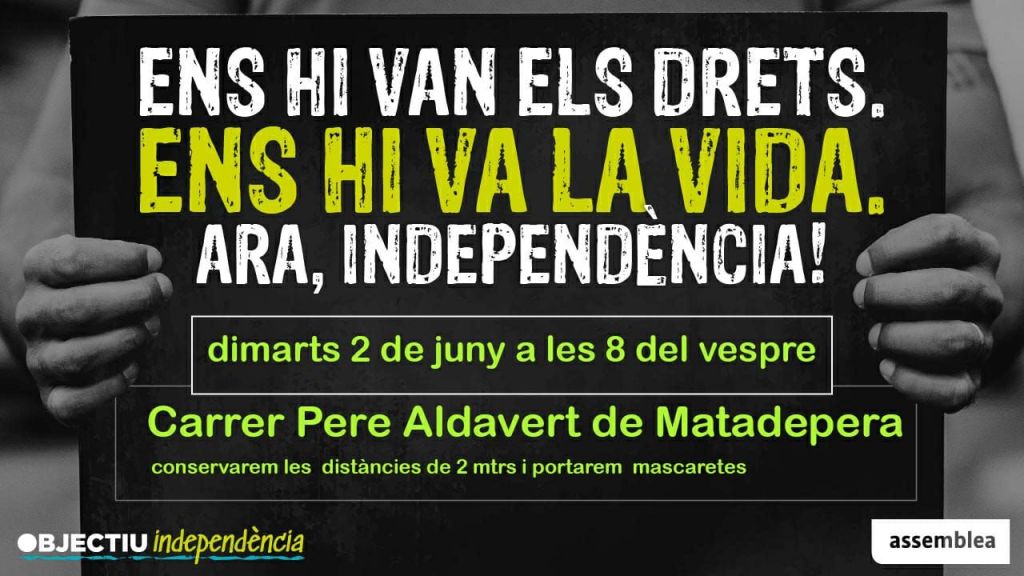 L’Assemblea considera que la crisi actual ha evidenciat que no tenim les eines suficients per gestionar el país. El confinament, mitjançant l’ús abusiu de l’estat d’alarma, s’ha fet servir per retallar drets. La independència és l’única eina que tenim de construcció nacional per poder superar aquesta crisi amb garanties.
