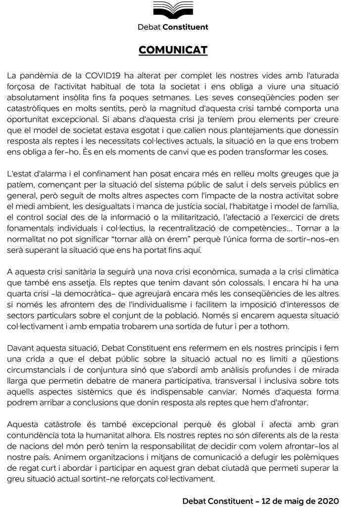 Debat Constituent fa una crida a analitzar amb profunditat les causes i conseqüències de la crisi de la COVID19 i a afrontar col·lectivament els reptes que provoca.
