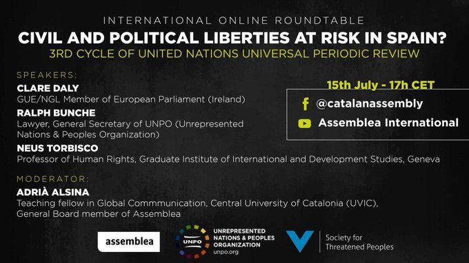 Aquest dimecres, 15 de juliol, taula rodona digital internacional amb Clare Daly, eurodiputada irlandesa (GUE-NGL); Ralph Bunche, secretari general de l’UNPO, i Neus Torbisco-Casals, experta en drets humans.