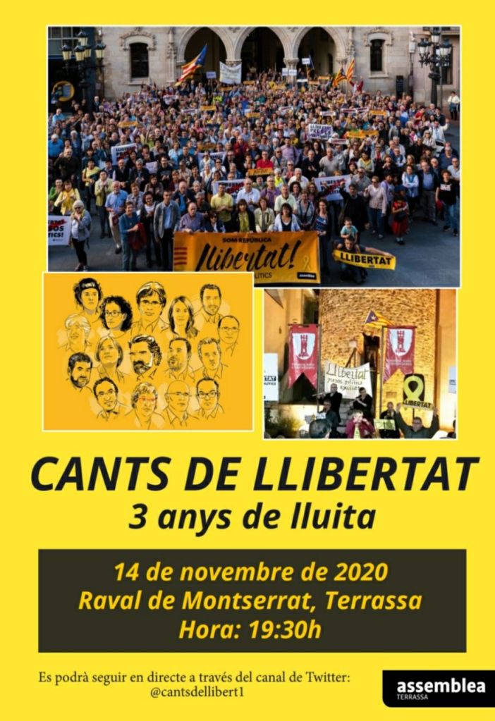 Aquest dissabte 14 de novembre, es farà a Terrassa la commemoració dels 3 anys dels Cants de la llibertat. Són 3 anys seguits de reclamar la llibertat dels presos polítics i el lliure retorn dels exiliats.