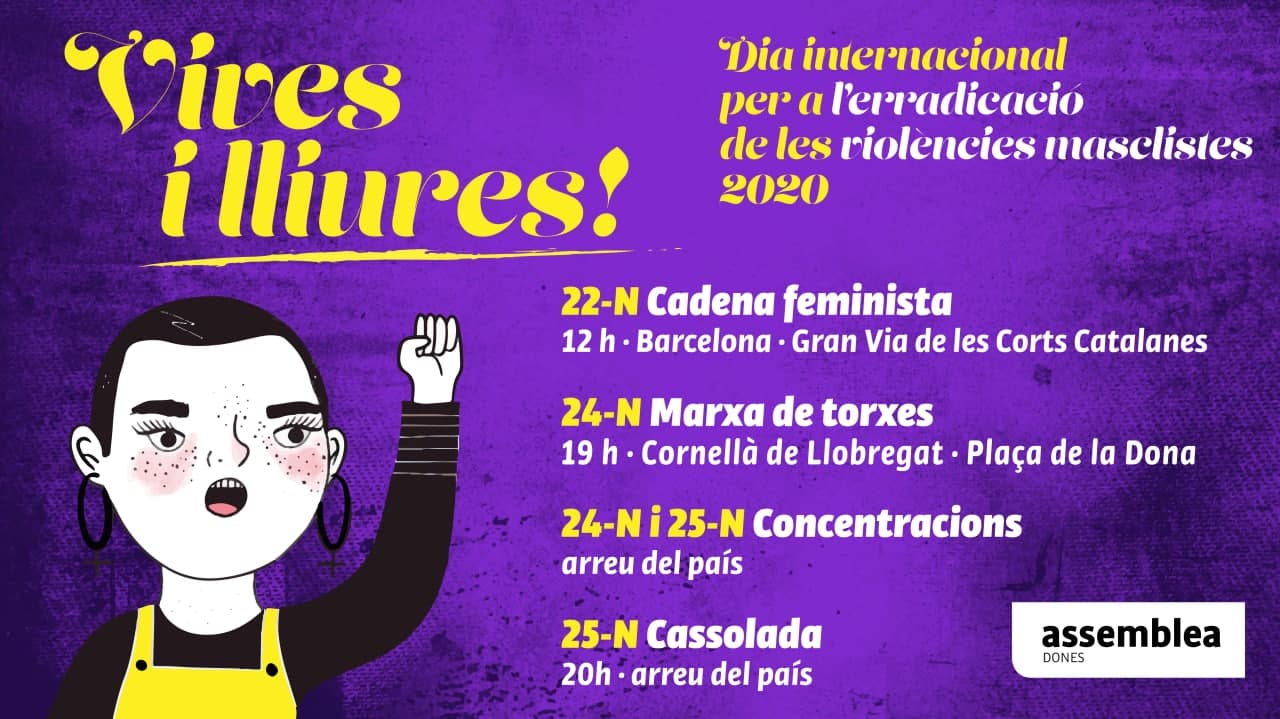 Aquest 2020 la pandèmia ha impactat totalment en les nostres vides i una vegada més les crisis sanitària, econòmica i social agreujades per la covid-19 tenen efectes més devastadors en les vides de les dones i les criatures. Per això el 25 de novembre ens hem d’alçar i exigir a la societat que igual que volen derrotar al virus que ens assetja cal combatre amb la mateixa energia totes les formes de violències masclistes malauradament presents en el dia a dia de les nostres ciutats i pobles i massa cops invisibles, perquè malgrat els esforços i les reivindicacions continuem veient dones assassinades només pel fet de ser dones, cada dia i a cada petit racó del món!