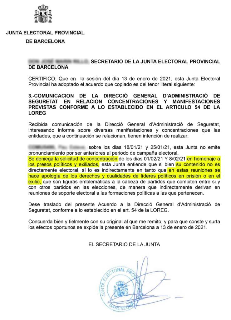 La Junta Electoral Provincial de Barcelona ha prohibit a l’Assemblea l’organització de concentracions en favor de les preses i presos polítics al·legant que el seu contingut és indirectament electoral.