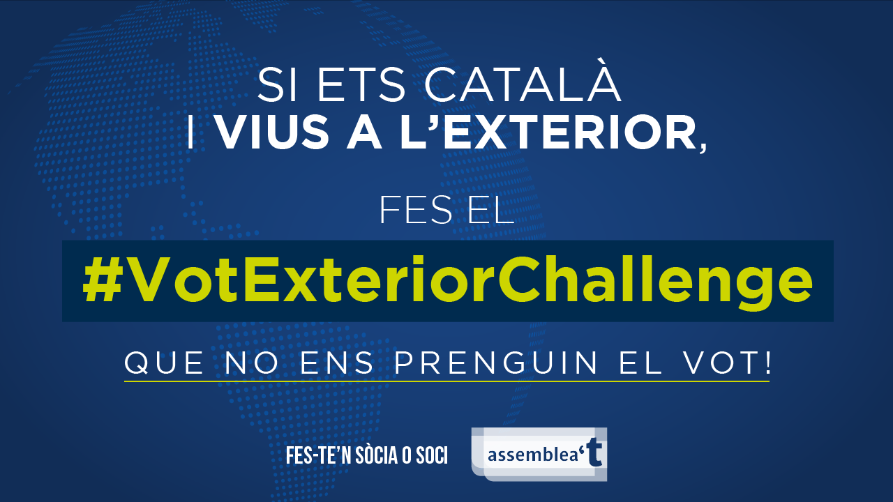 L’Assemblea Nacional Catalana ha llançat la campanya #VotExteriorChallenge, que vol potenciar el vot exterior independentista a les eleccions al Parlament de Catalunya previstes per al 14 de febrer del 2021, i a la vegada denunciar els obstacles que suposa el vot pregat per a la participació democràtica. El repte, per tant, és aconseguir participar en el procés electoral malgrat les dificultats, i posar de relleu i denunciar la poca fiabilitat del sistema.