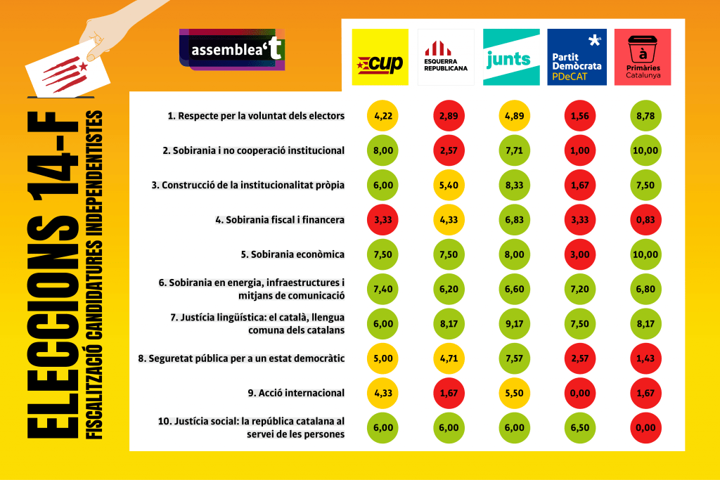 Aquesta tarda l’Assemblea ha presentat la valoració dels programes electorals de les llistes independentistes per les eleccions al Parlament de Catalunya. Aquestes valoracions s’han fet d’acord amb el Decàleg de principis d’acció política institucional.