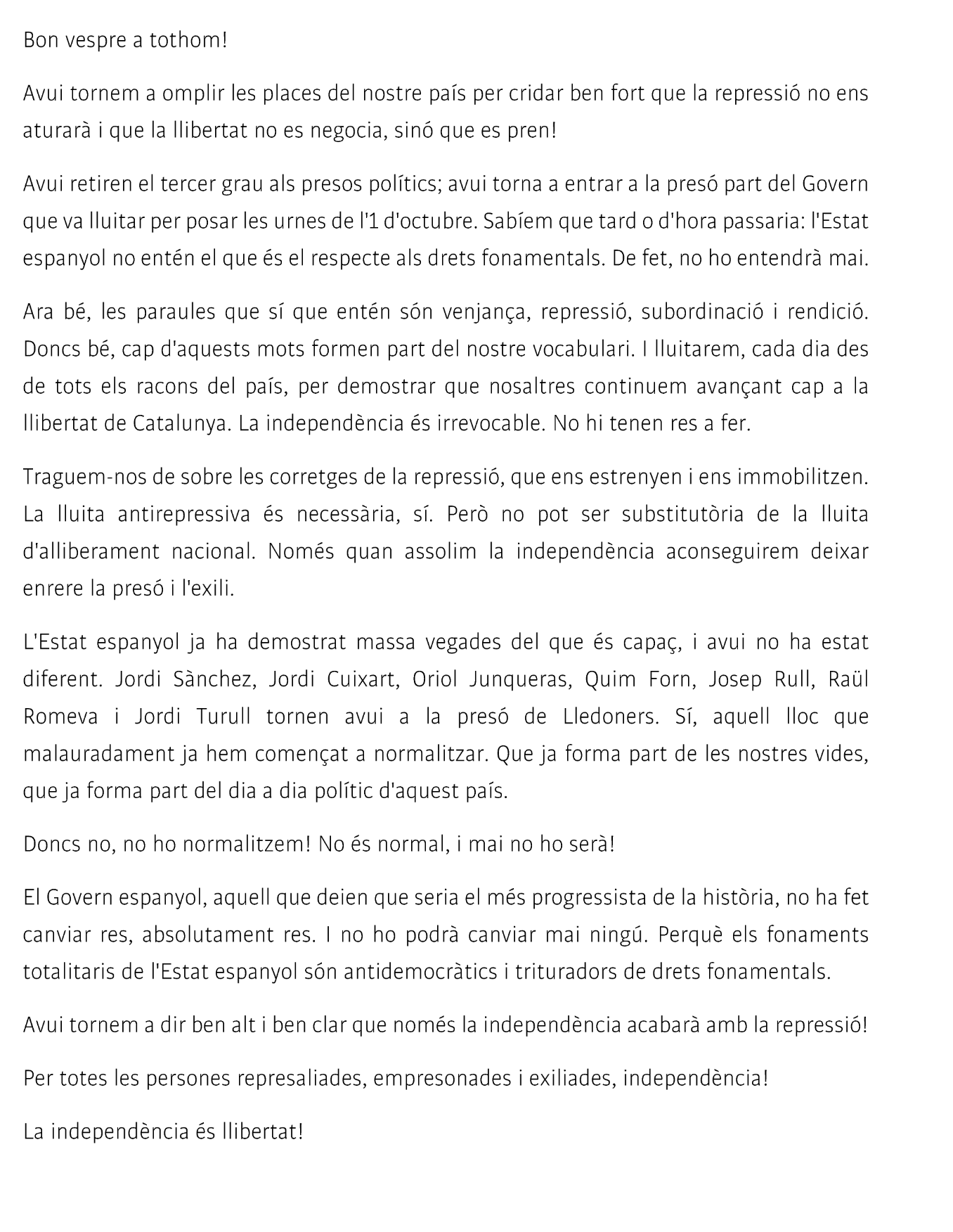 març 9 2021 9 de març, convocatòries contra la repressió als presos polítics Davant les noves mostres de repressió que avui ha dut a terme el govern espanyol contra els presos polítics, convoquem a sortir al carrer a exigir la seva llibertat. Manifest Feu clic per enviar un enllaç per correu electrònic a un amic (S'obre en una nova finestra) Correu electrònic Feu clic per compartir al Facebook (S'obre en una nova finestra) Facebook Feu clic per compartir a X (S'obre en una nova finestra) X Feu clic per compartir al WhatsApp (S'obre en una nova finestra) WhatsApp Feu clic per compartir al Telegram (S'obre en una nova finestra) Telegram Feu clic per compartir al Mastodon (S'obre en una nova finestra) Mastodon Més Feu clic per imprimir (S'obre en una nova finestra) Imprimeix Fes clic per compartir al Linkedin (S'obre en una nova finestra) LinkedIn Feu clic per compartir al Tumblr (S'obre en una nova finestra) Tumblr Feu clic per compartir al Pinterest (S'obre en una nova finestra) Pinterest Fes clic per compartir al Reddit (S'obre en una nova finestra) Reddit Feu clic per compartir al Pocket (S'obre en una nova finestra) Pocket M'agrada S'està carregant... Relacionats